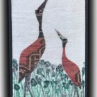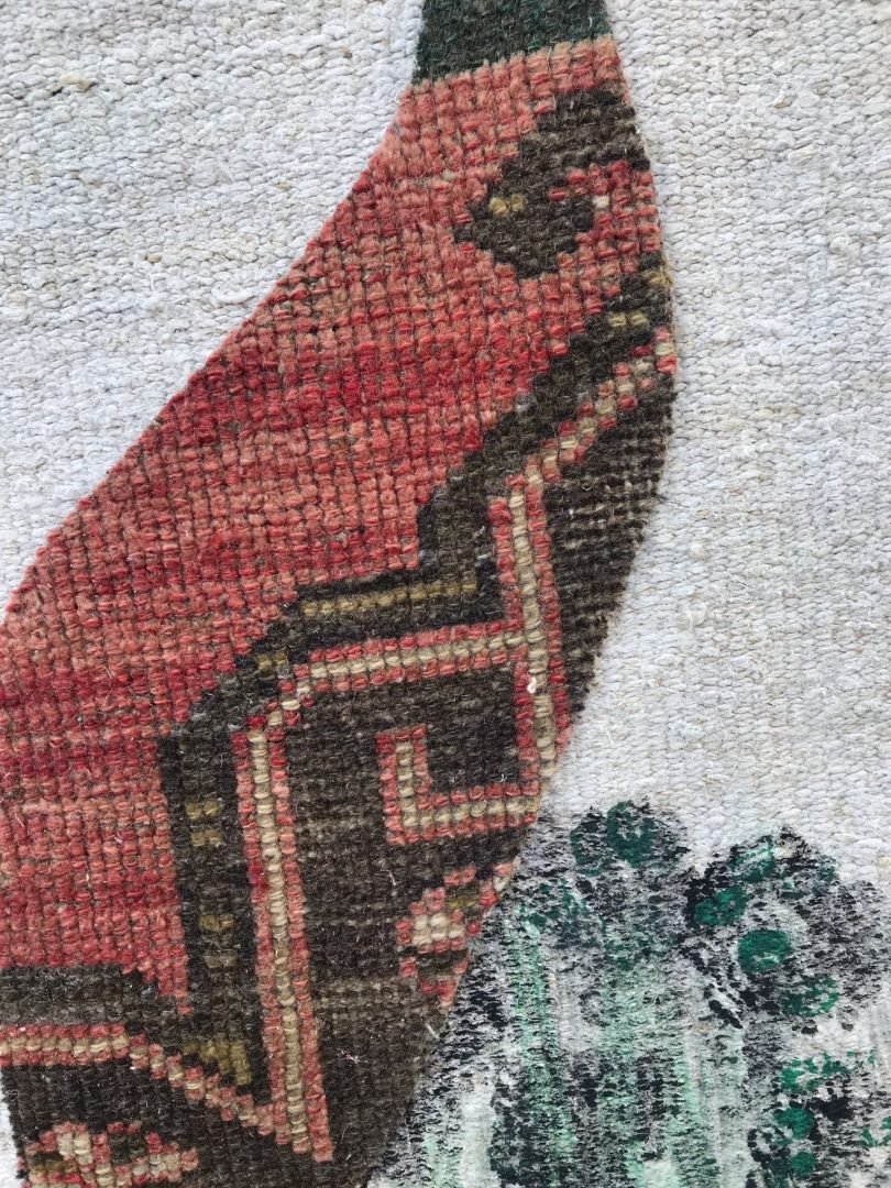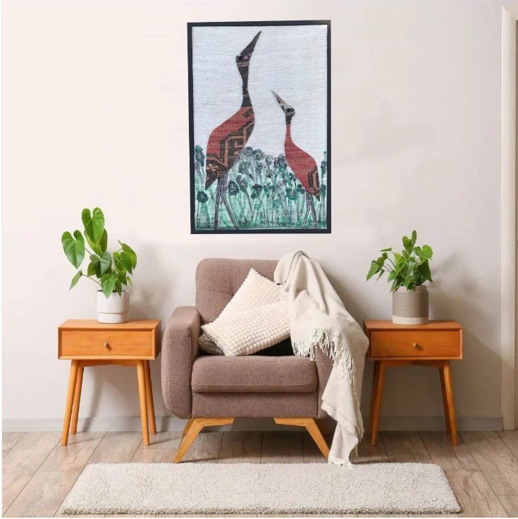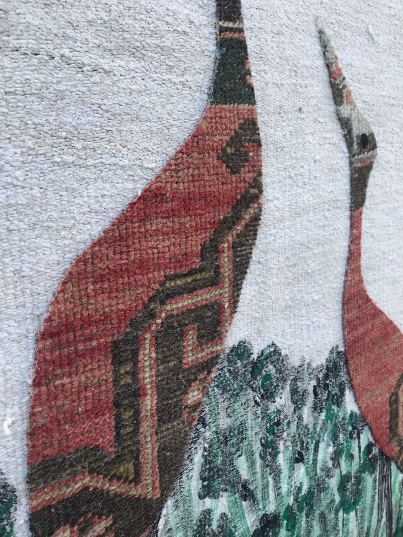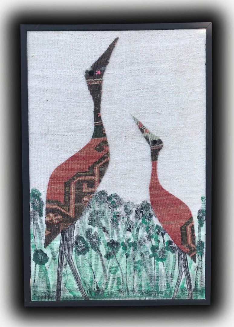 Dit tapijt is geïnspireerd door de eindeloze schoonheid van de natuur en toont de elegante silhouetten van twee vogels die naar de lucht stijgen. Het motief, geschilderd op hennep, symboliseert de vrijheid van de vogels met hun lange snavels. Deze vogels, die omhoog kijken, observeren de wereld en worden meegevoerd door de hoop en vrede die de lucht biedt.