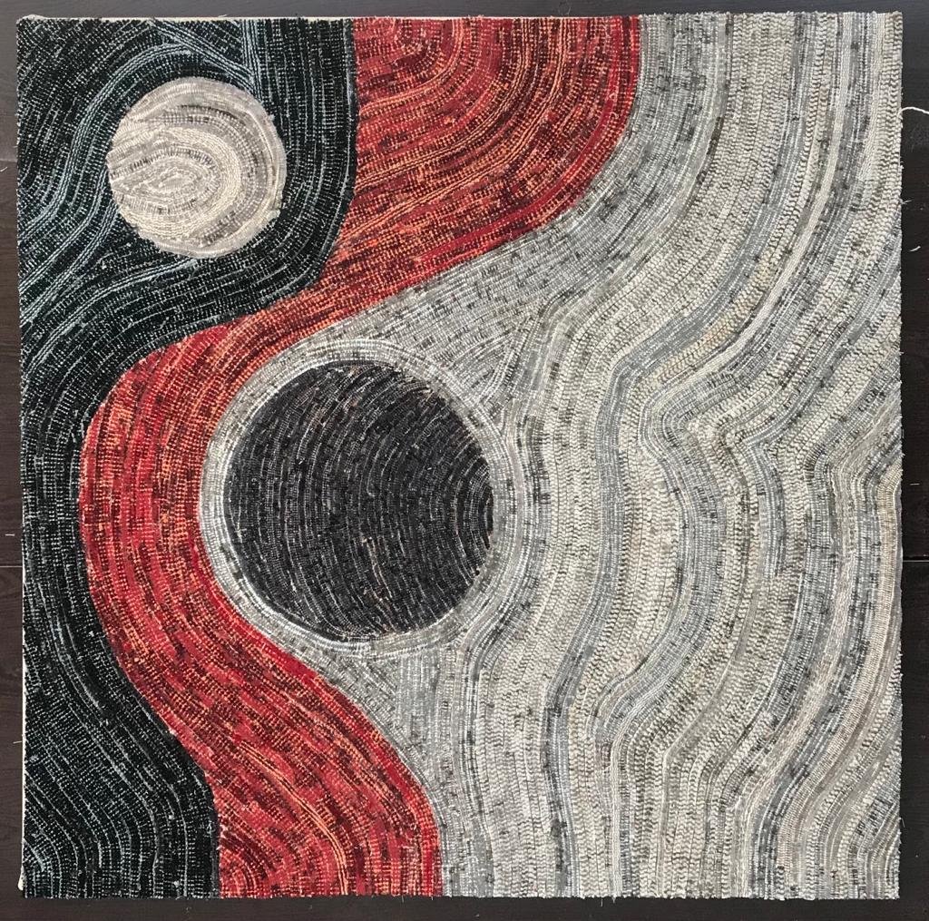 De vrouw loopt onder haar rode paraplu door de regen, rustig de wereld om haar heen observerend. De kruisende zwarte lijnen benadrukken het ritme en de textuur van de regen, terwijl de witte hennep een vleugje rust en elegantie toevoegt.